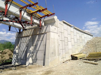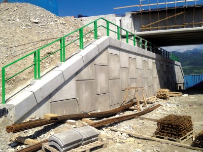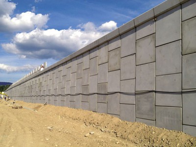 Systémy vystužovania zemín geosyntetikou sa pomerne často používajú pri konštrukciách oporných múrov a násypov. Príspevok opisuje systém vystužovania zemín pohľadovými betónovými prefabrikátmi a geopásmi a podrobnejšie sa venuje tomuto systému na stavbe diaľnice D1 Dubná Skala – Turany.