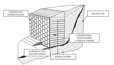 geopásmi a zeminou, ktorá ho priťažuje. Geopásy prenášajú ťahovú zložku napätia, ktorá v nich vzniká od zemných tlakov, na lícové prefabrikáty. Materiál telesa násypu a výstuž tvoria hlavnú časť systému a čelné prefabrikované panely slúžia na ochranu konštrukcie pred eróziou, a dávajú konštrukcii atraktívny vzhľad. Podľa STN EN 14475 je múr klasifikovaný ako zvislá oporná konštrukcia s tuhým lícovým prvkom a kĺbovým usporiadaním. Systém je ideálny na konštrukcie vertikálnych múrov, ktoré majú odolávať vysokému zaťaženiu, alebo tam, kde je požiadavka architekta na špecifickú povrchovú úpravu líca steny. Konštrukciu násypu tvorí kombinácia zásypového materiálu a výstužných geopásov na báze geosyntetiky (obr. 1). Systém sa vyznačuje suchým procesom výstavby, pričom sa prefabrikáty vyrábajú mimo staveniska. Je finančne nenáročný a výhodný z hľadiska jednoduchého zakladania, rýchlej výstavby a architektonického vzhľadu.
