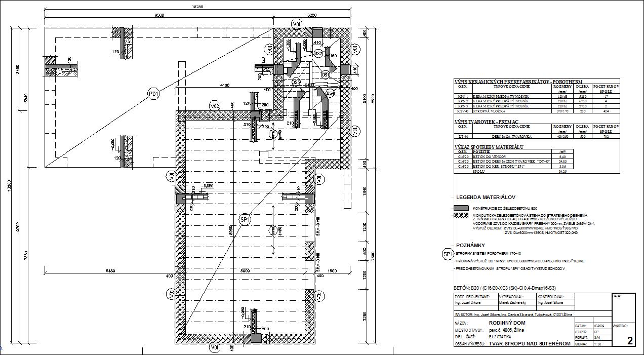 - Vodorovné nosné konštrukcie – strop nad suterénom je riešený ako prefabrikovaný keramický stropný systém Porotherm hr.170mm s nadbetonávkou hr.40mm uložený na obvodové nosné steny suterénu.